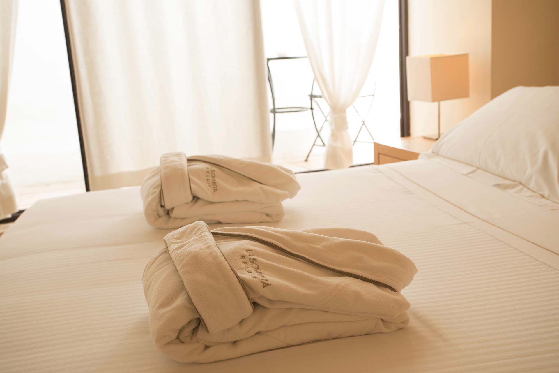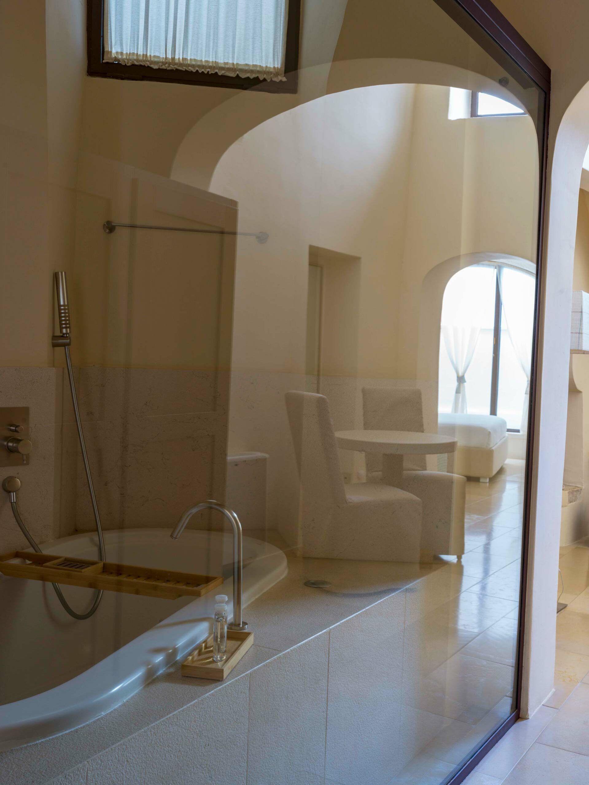 A completare l’ambiente, un esclusivo bagno in pietra e marmo, arricchito da una vasca a vista, che contribuisce a rendere l’atmosfera ancora più suggestiva. Il design fonde armoniosamente eleganza raffinata e uno stile moderno e rilassato, creando un’esperienza di comfort e serenità.