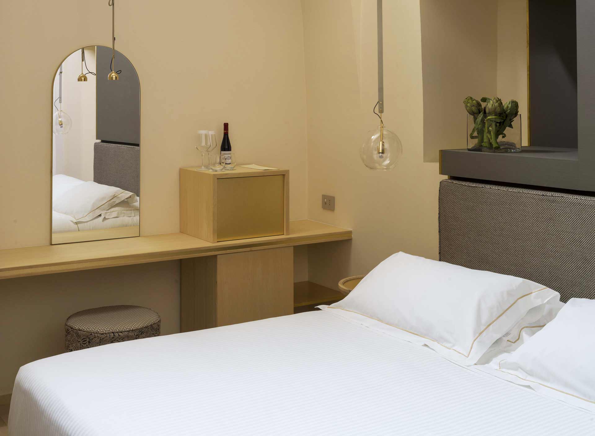 Questa camera dal design unico è caratterizzata da un suggestivo lucernario posizionato nella parte più alta della parete, che lascia filtrare delicatamente la luce naturale al posto delle tradizionali finestre.
